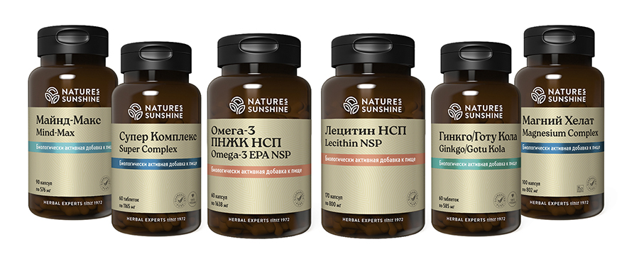 Следует подчеркнуть, что витамины группы В благотворно влияют на многие мозговые функции: улучшают память, мышление, обостряют восприятие информации и повышают внимание, а также эффективно снимают стресс, возбуждение, купируют депрессивный синдром. Такое же действие оказывают: Омега-3 ПНЖК, лецитин, целый ряд аминокислот (триптофан, глицин, глутамат, серин, тирозин, таурин), готу кола, бакопа, гуарана, женьшень, элеутерококк. Нейропротективным действием обладают и другие пищевые и фито ингредиенты.