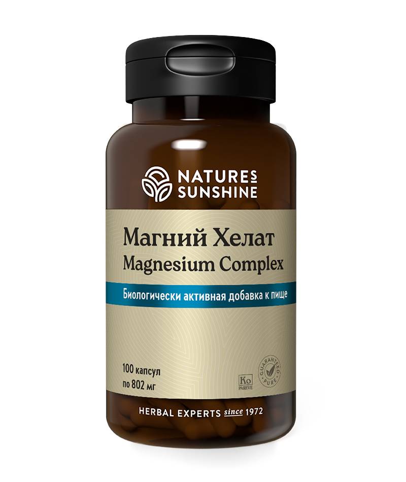 Магний – один из наиболее важных биоэлементов, в значительных количествах содержится в тканях животных и растений (хлорофилл). Магний – важнейший электролит, он является кофактором многих ферментативных реакций. Магний участвует в превращении креатинфосфата в АТФ, необходим на всех этапах синтеза белка. О дефиците магния свидетельствуют: нарушения сна, повышенная раздражительность, необъяснимая тревога, повышенная утомляемостью, спазмы икроножных мышц, у детей – синдром гиперактивности. В более тяжелых случаях отмечают повышенную подверженность стрессам, нарушение сердечного ритма, запоры, осложнение предменструального синдрома. Потребность в магнии увеличивается при потливости, частом употреблении слабительных и мочегонных, алкоголя, при больших психических и физических нагрузках (в первую очередь при стрессах и у спортсменов). В каждой капсуле БАД Магний Хелат содержится 100 мг чистого магния, который находится в хелатном соединении с органическими кислотами яблочной и лимонной кислотой, что обеспечивает максимальное усвоение этого макроэлемента.